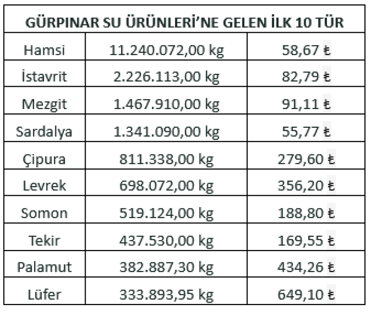 Geçen yılın Eylül, Ekim ve Kasım aylarının şampiyonu olan palamut yerini hamsiye bıraktı. Bu yıl 11 bin 240 ton hamsiyi, 2 bin 226 ton ile istavrit, bin 468 ton ile mezgit takip etti. En çok satışa sunulan diğer balıklar sırasıyla sardalya, çipura, levrek ve somon oldu.