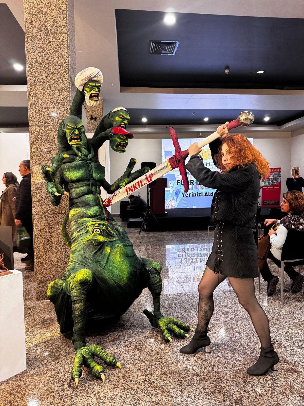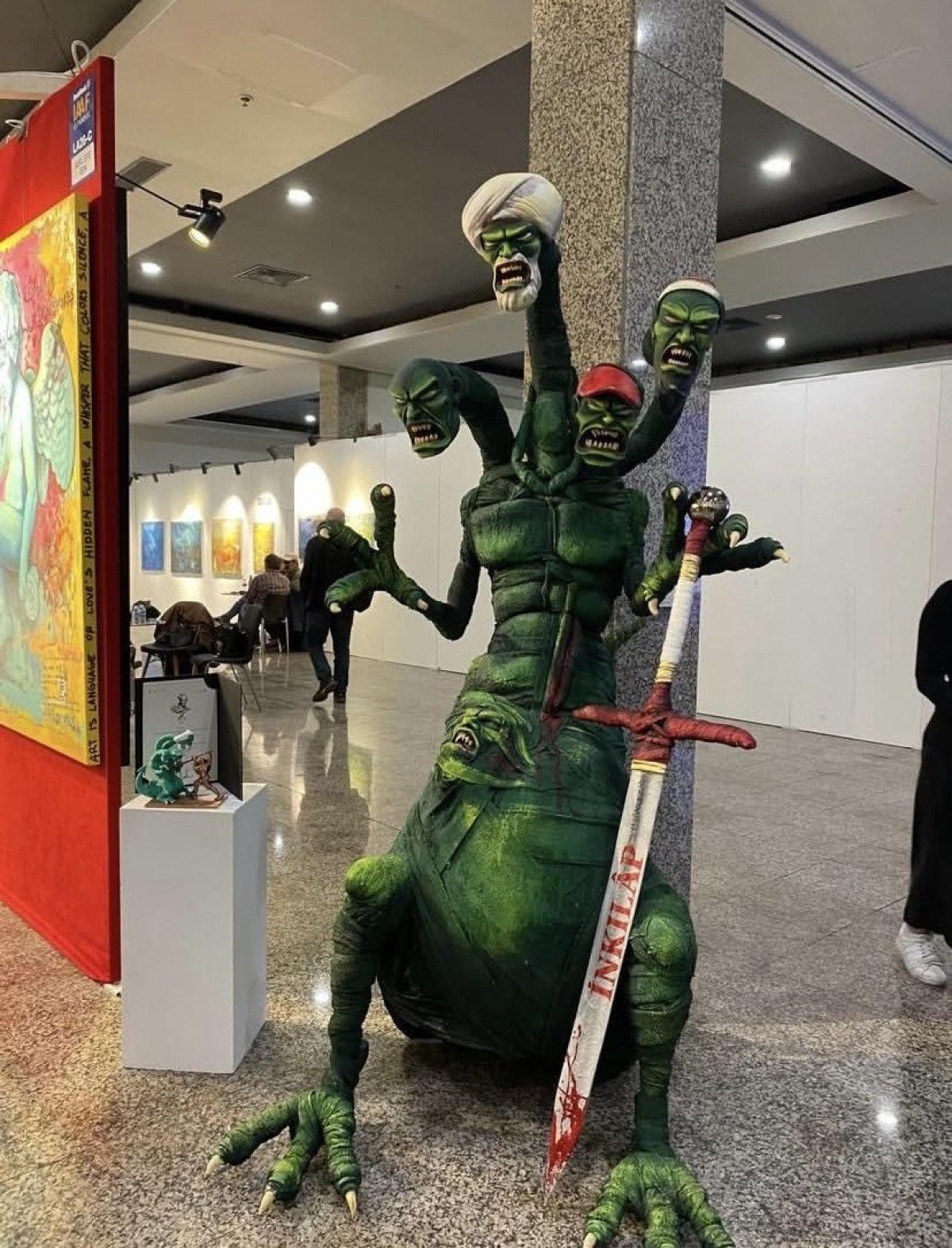 Daha önce sarıklı figürleri aşağılayan “Cumhuriyet Muhafızları” adlı heykelciği sebebiyle gözaltına alınan Kaftar, bu kez İstanbul Lütfi Kırdar Uluslararası Kongre ve Sergi Sarayı’nda sergilenen çalışmasıyla büyük tepki çekti.
